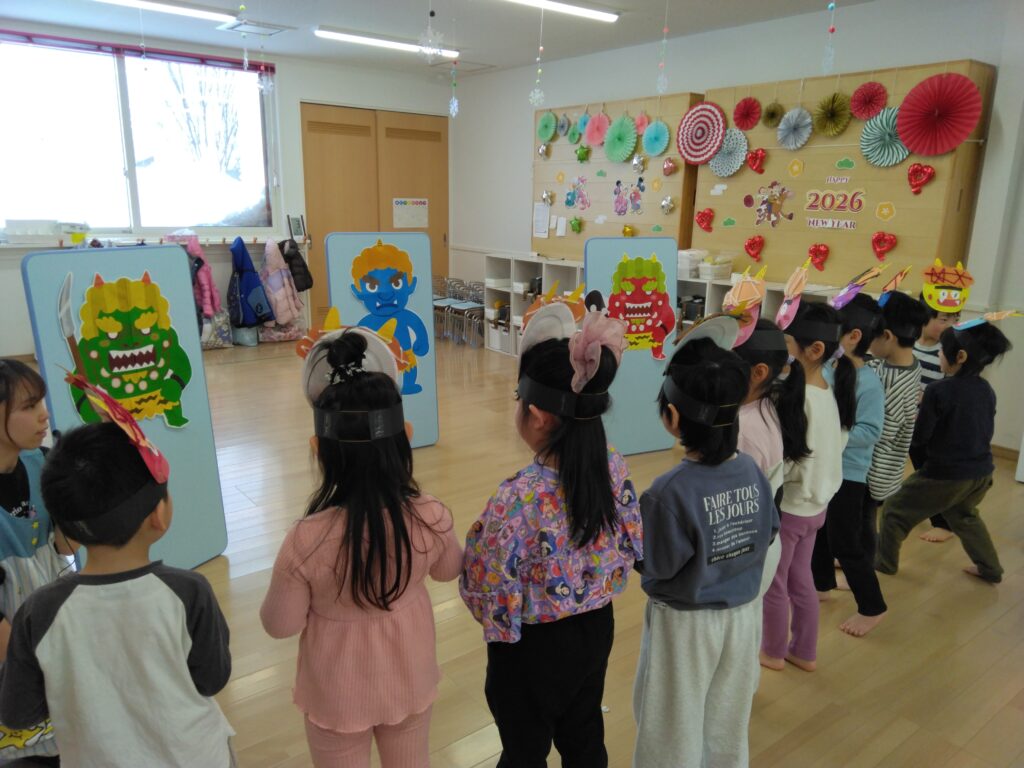 節分についてのお勉強をした後に、保育園に赤鬼と青鬼が来たのでみんなで豆まきしました。